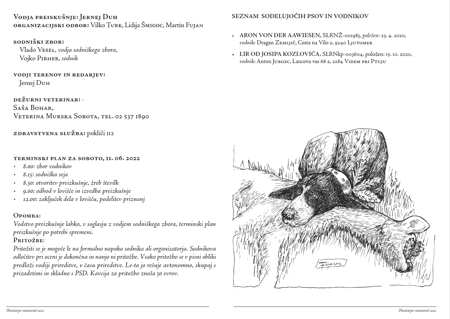 Ob 8. uri smo se pred upravno stavbo LPN Fazan Beltinci zbrali: oba vodnika, predsednik DLP Vilko Turk kinološka sodnika Vojko Pirher in Vlado vesel, vodja prireditve Duh Jernej in dve lovski pripravnici iz LD Podvelka. Po uvodnem nagovoru predsednika DLP je sledil žreb številk in kratek napotek Vesel Vlada. Na preizkušnjo sta bila prijavljena nemški kratkodlaki ptičar Lir od Jospia Kozloviča z vodnikom Jurgec Antonom in nemški žimavec Aron v.d. Aawiesen z vodnikom Zemljič Draganom.